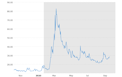 Another great idea for capitalizing on the coming volatility, which is expected to spike significantly during the month of October (historically a month that has extremely high volatility) is an exchange traded fund that tracks 1.5x the VIX index, the ProShares Ultra VIX Short-Term Futures ETF (UVXY). As you can see, the VIX recently started to trend back up slightly but has been on a general downtrend from March as you would expect due to the recovery in the market.