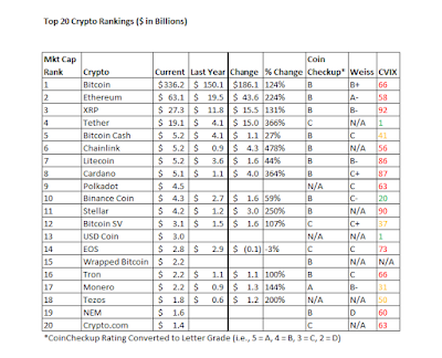 For this year's update, I kept the Coin Checkup and Weiss rankings (if available) and added the "CVIX" rating. The CVIX reflects monthly price fluctuations within the 10% range, so a higher number represents higher volatility/risk and a lower number represents a lower volatility/risk. The CVIX can be found on crypto-rating.com if you're interested in more information. The table below is sorted by current market cap and includes the rankings as discussed above: