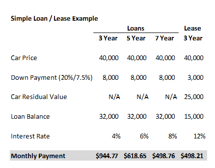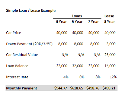 Here's how the numbers look (see table below with a simple example). You'll see that you actually pay a much higher interest rate on a lease, but the monthly payment is lower because you give back the low-mileage car at the end of the lease - the residual value of the vehicle effectively reduces the amount you are financing. Note the lower loan balance that's assumed ($40,000 car price less $25,000 residual value equals "loan" amount of $15,000). Typically the lease includes a rent charge in addition to the vehicle depreciation, but for simplicity I have combined the two into one amount of $15,000 for this example. The down payment of $3,000 is really just a prepayment of the lease and can be any convenient amount the dealer wants to charge. This is frequently discounted in order to entice you into leasing the car, depending on how motivated the dealer is to move the car off their lot.