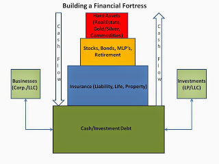 Being able to recognize opportunities in the midst of the chaos and developing and implementing a plan to take advantage of those opportunities is key, but only the "base" of your Fortress is strong. The base is cash and cash equivalents and may include investment debt (so long as that debt is covered by the cash flow of the investment it was used to purchase, such as a rental property). The chart below outlines the Financial Fortress graphically: