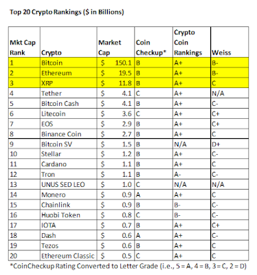 There continues to be very few published cryptocurrency rating systems in the market, a big reason why I started doing these updates quite some time ago. Rency no longer publishes ratings (site looks like it went out of business), but there is a new rating site called Crypto Coin Rankings that I referenced in the table below, along with industry stalwarts Coin Checkup and Weiss, which continue to put out coin ratings. While Crypto Coin Rankings seems to suffer from "grade inflation," it's still a worthy data point to consider.