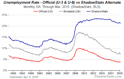 Companies going public that don't make money, at least not yet (i.e., Uber, Lyft, etc.) - a sure sign of irrational exuberance, right?Oil price spikes, which are pretty reliable predictors of recessions and stock market correctionsChina trade war and economy concernsEurope slowdown concerns and threat of new trade war frontWeekly ETF / Mutual Funds Flows show a lot of movement into bonds from stocks recently, indicating investors are taking a more defensive stanceUnemployment may be worse than reported (see chart below with alternative stats)Fear and Greed Index shows Greed - if you're a contrarian that's bad and means it's time to head for the hills