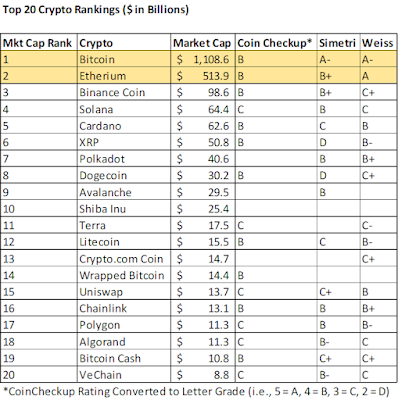 Seems like every week there is big news in the cryptocurrency industry. The latest news out of El Salvador is they are issuing $1Bn of "volcano bonds." Half of the bond proceeds would be used to buy bitcoin to hold as collateral and half would be used to build a new "bitcoin city," powered by geothermal energy from a nearby volcano. Value Added Taxes levied in the new city would be used partially for essential services and partially to repay the bonds. There would be no other taxes in the new city. After five years, the bitcoin can be sold to retire the bonds early and if bitcoin continues to appreciate at historical rates (200% per year on average), this could be very lucrative and allow for full repayment of all amounts outstanding while still being able to hold some of the originally purchased bitcoin. El Salvador is the first nation in the world to make bitcoin legal tender and requires merchants to accept it. The country has also started mining Bitcoin using one of its geothermal power plants. Pretty amazing. It is clear that there continues to be a lot of innovation, traditional finance is being disrupted and institutional adoption is growing rapidly. Below is my updated Crypto Ranking summary, excluding the stable coins and sorted by market capitalization from largest to smallest with ratings (where available) from three sources, including Coin Checkup, Simetri and Weiss.