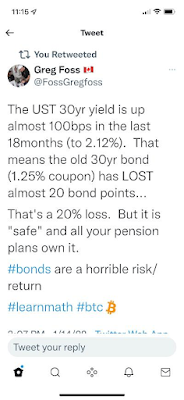 I was recently listening to a podcast "Chaos in the Bond Market" on What Bitcoin Did with Peter McCormack. His guests were two guys I follow on Twitter, Lawrence Lepard and Greg Foss. Lawrence is a precious metals fund manager who also has a strong and balanced appreciation for the benefits of investing in Bitcoin, which is very much in line with my way of thinking. Greg is a former bond trader and investor who has a significant allocation to Bitcoin but also advocates for some portfolio diversification, which again is very much in line with my way of thinking. After the podcast, Greg posted the below tweet which summarized one of his key comments about how bonds have traditionally been considered low risk investments, but that may no longer be the case. Here's the tweet: