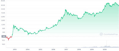 Leveraging Bitcoin investments into the Roth IRA with Bitcoin's asymmetric growth prospects makes for a powerful retirement vehicle. Here's a quick example. Let's say you contribute $40K to a Roth and pay taxes at a 40% rate, you would have paid $16K in taxes on that money since it is contributed after tax. If the price of Bitcoin rises 10x over the next 10 years to $400K, then you avoided $144K in taxes ($160K - $16K). If the price of Bitcoin rises 100x over the next 10 years to $4M, then you avoided $1.584M in taxes ($1.6M - $16K). That's very powerful stuff. Bitcoin has had an average annual increase of 200% since inception with plenty of volatility up and down. If you zoom out (chart below) the consistent upward growth rate on the log chart is impressive. With Bitcoin adoption globally still very low and a hard capped, fixed supply, the growth rate of Bitcoin seems likely to continue into the future.