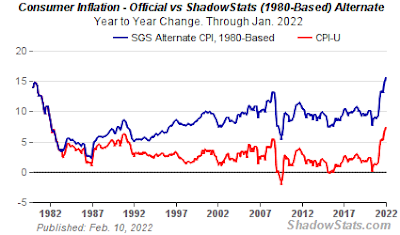 Another crazy, crazy month in the markets! Bitcoin showing some upside recently and helping out my portfolio overall. Also some good news on Bitcoin adoption this week as accounting firm KPMG - Canada adds Bitcoin to its balance sheet. However, stocks (especially tech / growth) and bonds got absolutely clobbered. Gold, silver and commodities (especially oil) continue to look strong in the face of a 40-year high inflation print of 7.5% from the BLS. With the inflation report as always, the devil is in the details, with energy +27%, used cars and trucks +40.5% and new vehicles +12.2%; oddly, shelter is only +4.4%, which seems low given we are seeing rent and home price appreciation in high double digits, at least where I live. My regular readers will know I don't have a lot of faith in the official statistics, since the method of calculation has changed over the years and I often refer to the alterative measure published by Shadowstats (see chart below), which would indicate inflation is really above 15%.