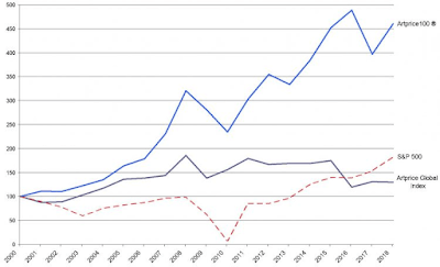 Each piece is carefully vetted and unique and therefore scarce, which improves chances for strong returnsAdditionally, over time the works of popular (deceased) artists find their way into museums and off the market, thereby increasing scarcity of the artist's work over timeCan potentially be a hedge against inflation Diversification of portfolioLow correlation to other asset classes (see chart below - top performing artists as represented by the Artprice 100 have far outpaced S&P 500 historically)Anyone can invest (no need to be an accredited investor) and low initial offering price of $20 per share for each work of artWorks of art valued in the millions or tens of millions that would not ordinarily be available to small individual investors can be invested inArt is protected and insured