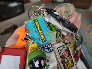 Further in, and underneath a windbreaker, it's a hodgepodge of trophies and plaques. But it's not them I am too dialed in on. Somehow pushed from brain from this era (age 13 to 18, give or take) was an obsession with collecting keychains. Some were sentimental, like one from my trip to Death Valley, Marvin the Martian from a trip to Disneyland, or the 1-800-Collect, Class of '97 keychain. Others were random, an assortment of swag from insurance agencies or car dealerships and it makes me wonder, "Did I go wrong in not pursuing this hobby further?"