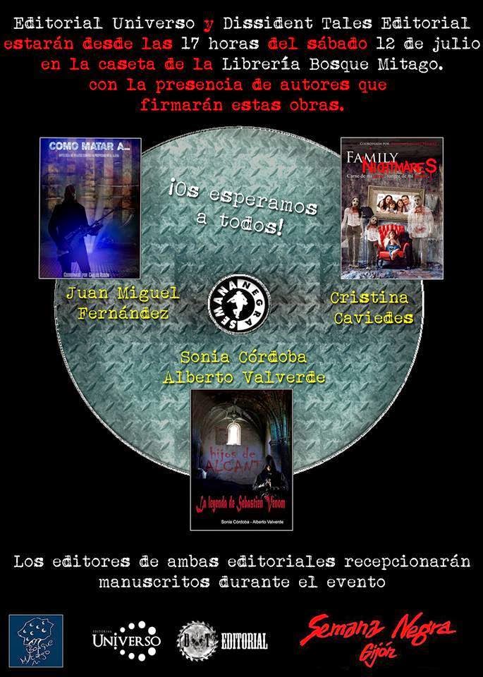 Y mañana estaremos en Gijon, en el stand de la fantástica Librería Bosque Mitago , celebrando la SEMANA NEGRA. Junto con nuestra editora Cristina Caviede s, Carlos Rodón , compañero y editor de Dissident Tales , firmaremos ejemplares a partir de las 17h. Así que os esperamos si estáis por la zona.