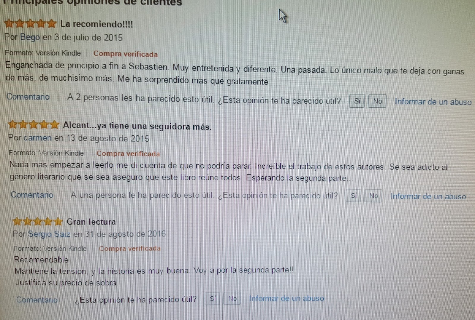 A cambio, ese minutito, ese momento que vais a perder puntuando y valorando la novela en Amazon (si tenéis cuenta en la plataforma, aunque hayais leido el libro en fisico y no lo hayáis descargado a través de Amazon también podéis puntuar) es importantisimo para el crecimiento de los autores, de su obra, y para como hemos dicho, ayudar y aconsejar a otros lectores, animarlos, o quitarles las ganas (la opinión es libre, y si algo no te gusta, no hay que ser condescendiente)Por eso, desde Alcant, os pedimos por favor que si habéis leído nuestro trabajo, y tenéis cuenta en Amazon, perdáis un poco de vuestro tiempo en valorarlo.
