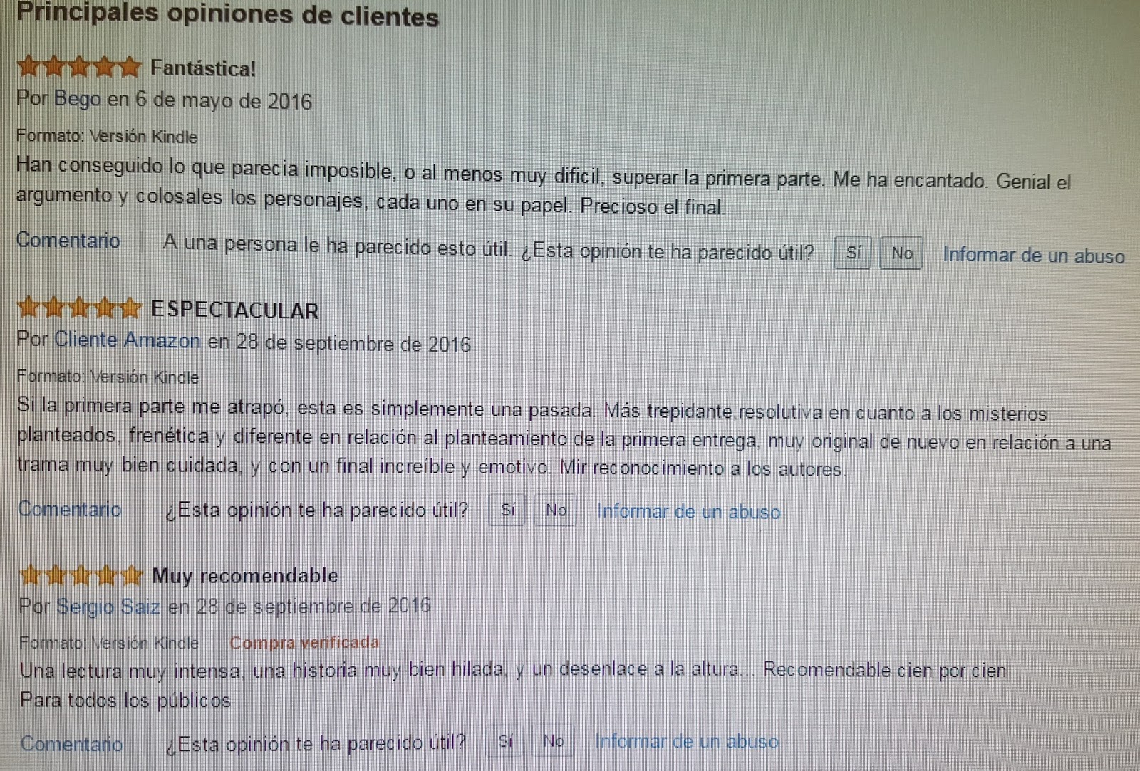 A cambio, ese minutito, ese momento que vais a perder puntuando y valorando la novela en Amazon (si tenéis cuenta en la plataforma, aunque hayais leido el libro en fisico y no lo hayáis descargado a través de Amazon también podéis puntuar) es importantisimo para el crecimiento de los autores, de su obra, y para como hemos dicho, ayudar y aconsejar a otros lectores, animarlos, o quitarles las ganas (la opinión es libre, y si algo no te gusta, no hay que ser condescendiente)