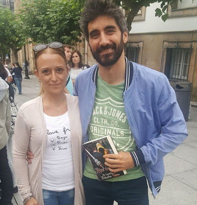 A media tarde recibimos la visita de otro compañero, Juan Miguel Fernández , y su mujer Eva Gabarri , con quien tuvimos el placer de compartir caseta en la Semana Negra de Gijón en 2014, quienes se acercaron antes de ir a la conferencia de Javier Sierra (quien finalmente no pudo asistir, así que tanto ellos, como nosotros que nos acercamos luego, no pudimos verle). Más charla informal y repaso conjunto a nuestras batallas editoriales y nuestros trabajos. Un gran tipo Juanmi, y un encanto Eva. Ya sabéis, todo gran hombre...