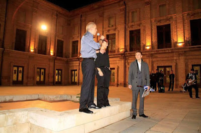 Acabando la visita al museo nos encontramos por fin con Isabel Soriano , miembro de la editorial y buena amiga y compañera a quien teníamos muchas ganas de ver y compartir con ella unos minutos poniéndonos al día y contándonos nuestras vicisitudes y proyectos literarios, que este año nos restó protagonismo llegando incluso más tarde que nosotros (lo nuestro con este certamen y los atascos en la autopista de Valencia se esta convirtiendo también en rutina. Una pena saber que ella y su simpático marido no pudieron quedarse a la posterior cena por cuestiones laborales.Tras el museo, la siguiente etapa del recorrido nos llevó a visitar algo absolutamente espectacular, el hermosos patio interior del monasterio, donde nos realizaron la que sin duda ha sido una de las entrevistas mas originales que nos hayan hecho, de mano del propio José Escobedo y de Kaplan Encadenados , "El Alcalde" (que ademas ejerció de fotógrafo y maestro de ceremonias junto a José, haciendo gala como todos los años de un excelente sentido del humor que mantuvo a todos los asistentes con la sonrisa en la boca. Las preguntas giraron en torno a nuestra manera de escribir conjunta y a distancia, algo que siempre llama la atención a todo el mundo, menos a nosotros que nos sale como algo normal (Siempre hemos dicho que ambos nos consideramos un único autor), y a nuestra experiencia en el certamen desde los dos puntos de vista desde los que hemos tenido el honor de participar, como concursantes y como jurado. Un bonito momento en el que una vez mas demostramos que con toda seguridad se nos de mejor escribir que hablar.Por cierto, de las cosas mas graciosas que nos sucedieron, fue que una asistente al evento nos reconoció de vernos en la televisión de Murcia el año pasado, durante la presentación en San Pedro del Pinatar de La leyenda de Sebastien Venom . Sobra decir la ilusión que nos hizo.