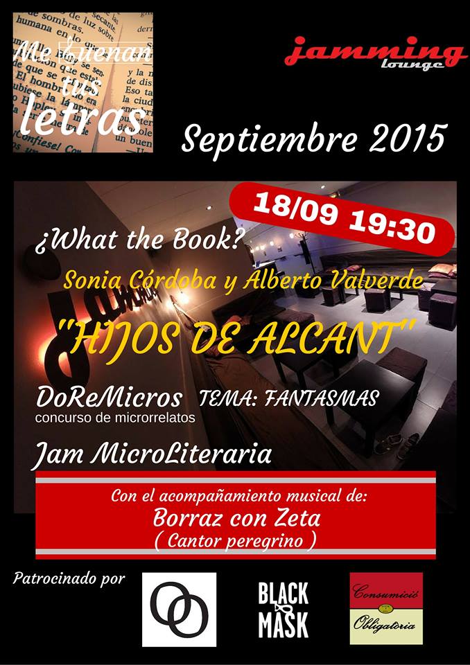 El próximo viernes 18 estaremos en el fantástico Jamming Lounge-Grácia presentando Hijos de Alcant, en el evento organizado por Me suenan tus letras . Un concepto cultural y literario diferente, con tendencia a performance, en el que no solo presentaremos la novela a través de la entrevista planteada por el presentador y gurú de este sarao Dedalo J. Borraz, sino que también habrá acompañamiento musical, certamen de microrrelatos para todo aquel que quiera participar (limite 200 palabras. Tema: FANTASMAS).