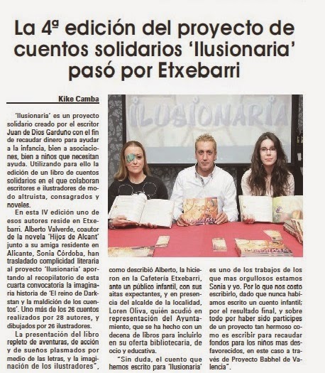 Os dejamos el extracto del periódico local de Etxebarri, haciéndose eco de la presentación de la antología benéfica Ilusionaria , que realizamos junto a nuestra compañera Bárbara Ros el pasado día 17.