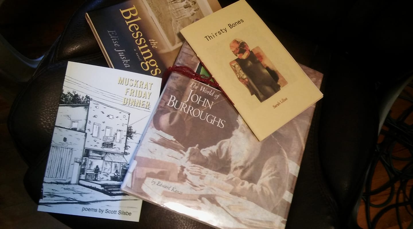 John Burroughs' copy of Thirsty Bones by Sarah Lilius, surrounded by other books. :)
