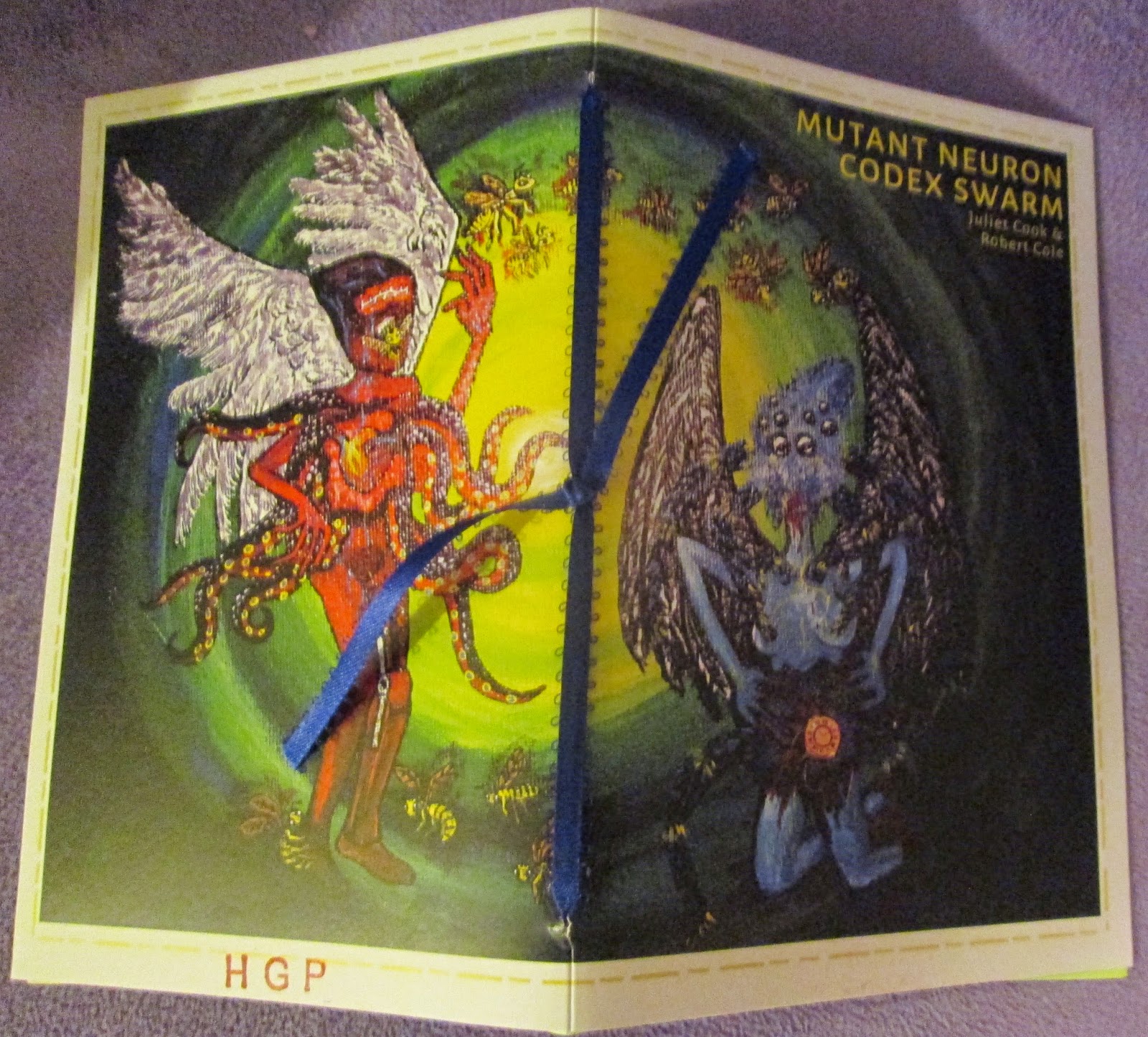 Both sides of the back/front cover of the new MUTANT NEURON CODEX SWARM poetry chapbook, a collaboration by Juliet Cook and Robert Cole, published January 2015, by Hyacinth Girl Press.