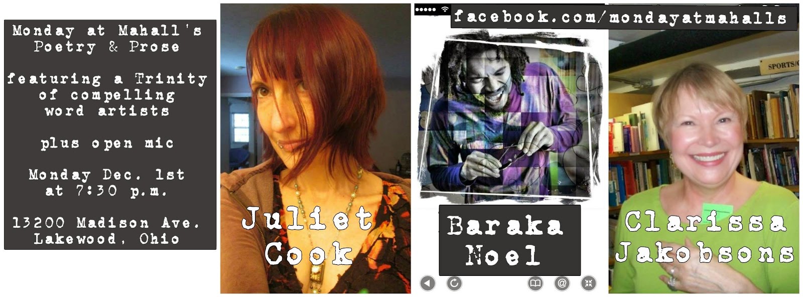 Thank you very much to emcee John Burroughs for inviting me to be one of the featured readers (along with Clarissa Jakobsons and Baraka Noel) at Monday at Mahall's December 1st.
