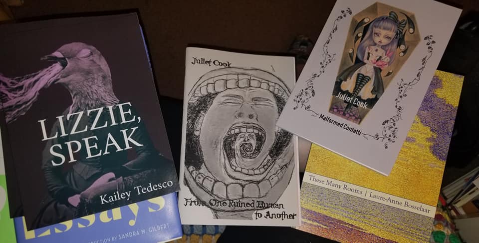 Jenny E Hudgens recently received copies of my 2018 poetry chapbook, "From One Ruined Human to Another" (Cringe-Worthy Poets Collective Press) AND my 2018 full-length poetry book, "Malformed Confetti" (Crisis Chronicles Press), both of which appear hear alongside a few other books, including the darkly delicious "LIZZIE, SPEAK" by Kailey Tedesco (White Stag Publishing, 2019)Anyone who does not yet have a copy of one or more of these books, I'll link to them below, in case you might be interested.