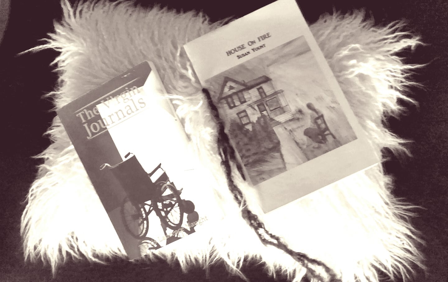 Eileen Murphy received her copy of the Blood Pudding Press poetry chapbook, "House on Fire" by Susan Yount, appearing hear beside "The Virgin Journals" by Travis Naught.
