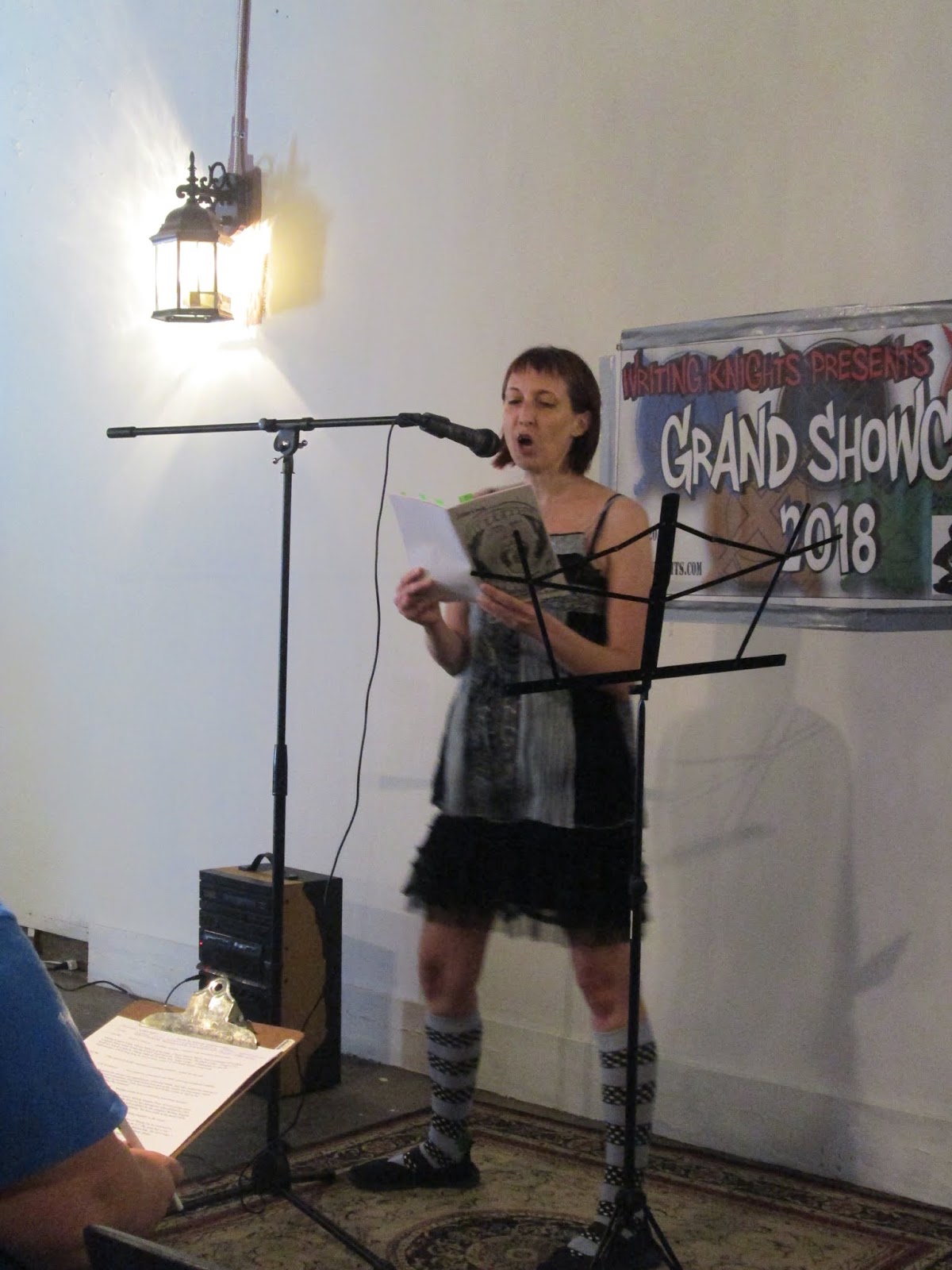 Me reading at the Writing Knights Grand Showcase, July 28, 2018