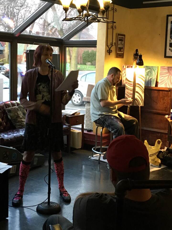 Me reading poetry and Brandon McCutcheon painting at Nervous Dog Coffee Bar in Akron, Friday April 27, 2018