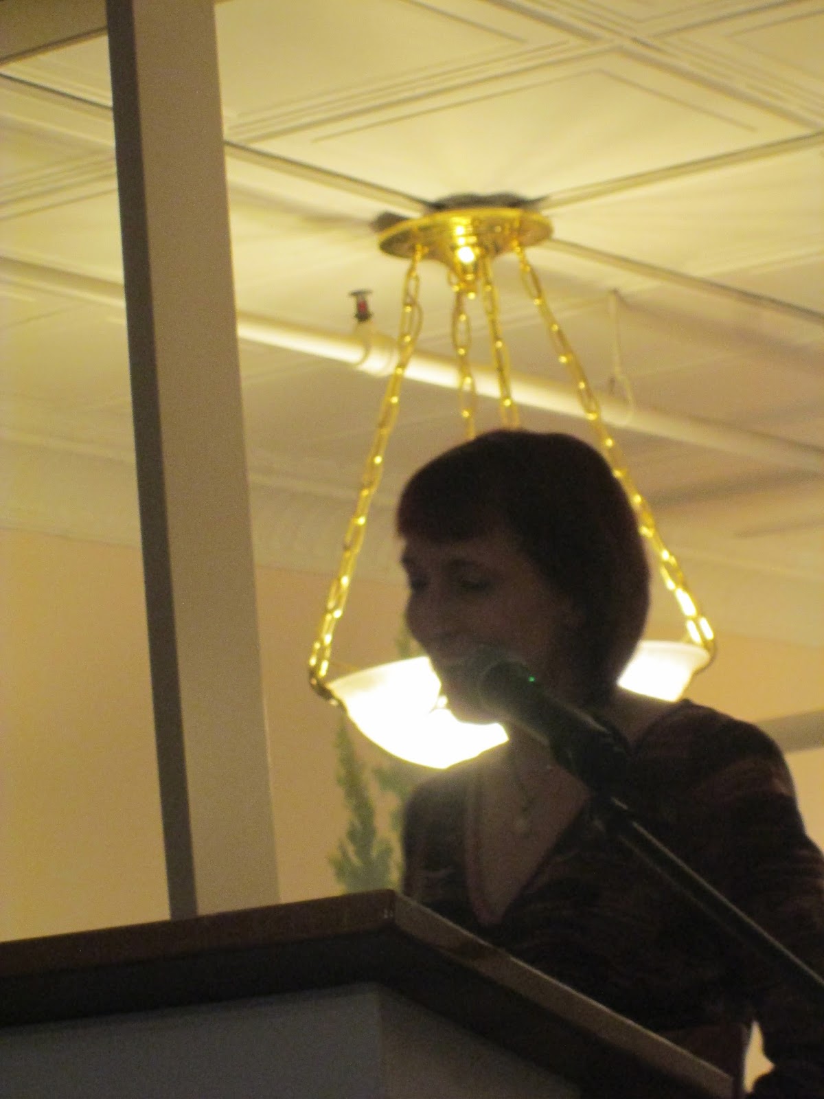 Juliet Cook (me), reading her poetry at the Borderlands: Oct Tongue book release reading on November 18, at Main Street Books