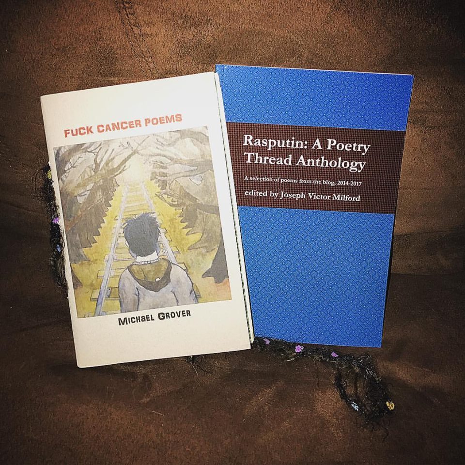 Drew Coomer received his copy of "Fuck Cancer Poems" by Michael Grover (appearing next to his copy of "Rasputin: A Poetry Thread Anthology")!