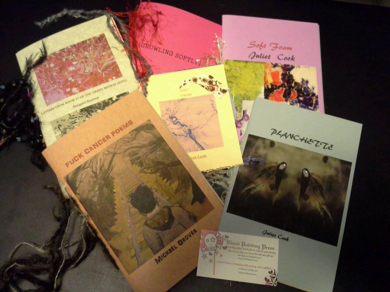 Vertigo Xi'an Xavier received his parcel of Blood Pudding Press poetry chapbooks! The new "Fuck Cancer Poems" by Michael Grover, and some older Blood Pudding chapbooks too...Growling Softly - a multi-writer chapbook (sort of like a onetime extra-special print lit mag) containing the work of 28 different poets, published 10 years ago!Three of Blood Pudding Press editor and poet Juliet Cook's own older chapbooks - Planchette (2008) - Soft Foam (2010) - and POST-STROKE (2011).Letters From Room 27 of the Grand Midway Hotel by Margaret Bashaar (2011).All of these chapbooks are still available from the Blood Pudding Press shop, linked to below.(photo taken by Vertigo Xi'an Xavier)https://www.etsy.com/shop/BloodPuddingPress