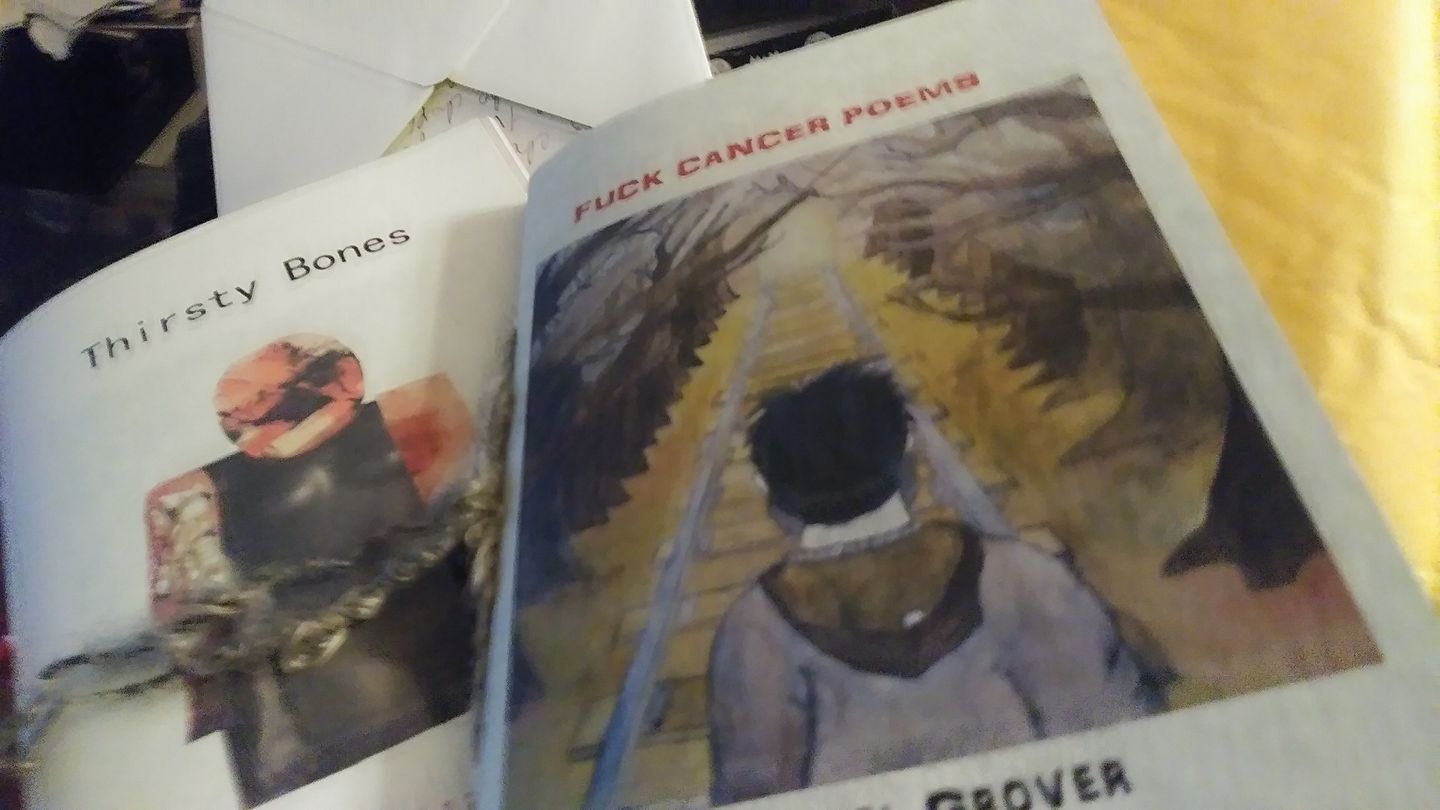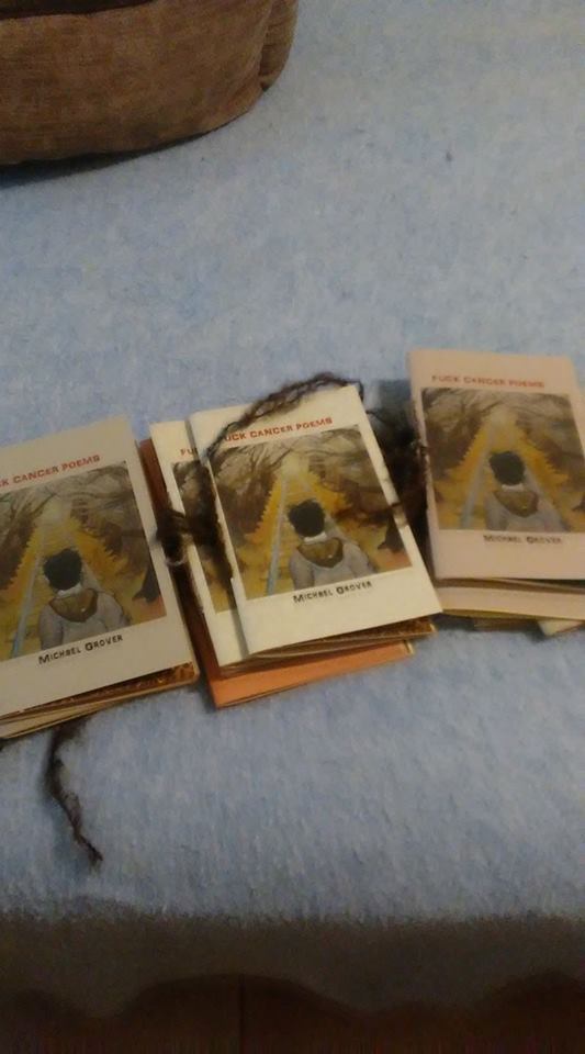 Poet Michael Grover's photo of his copies of his new "Fuck Cancer Poems" poetry chapbook, published by Blood Pudding Press - and Craig Firsdon's photo of his copy of "Fuck Cancer Poems", for which he created the cover art.
