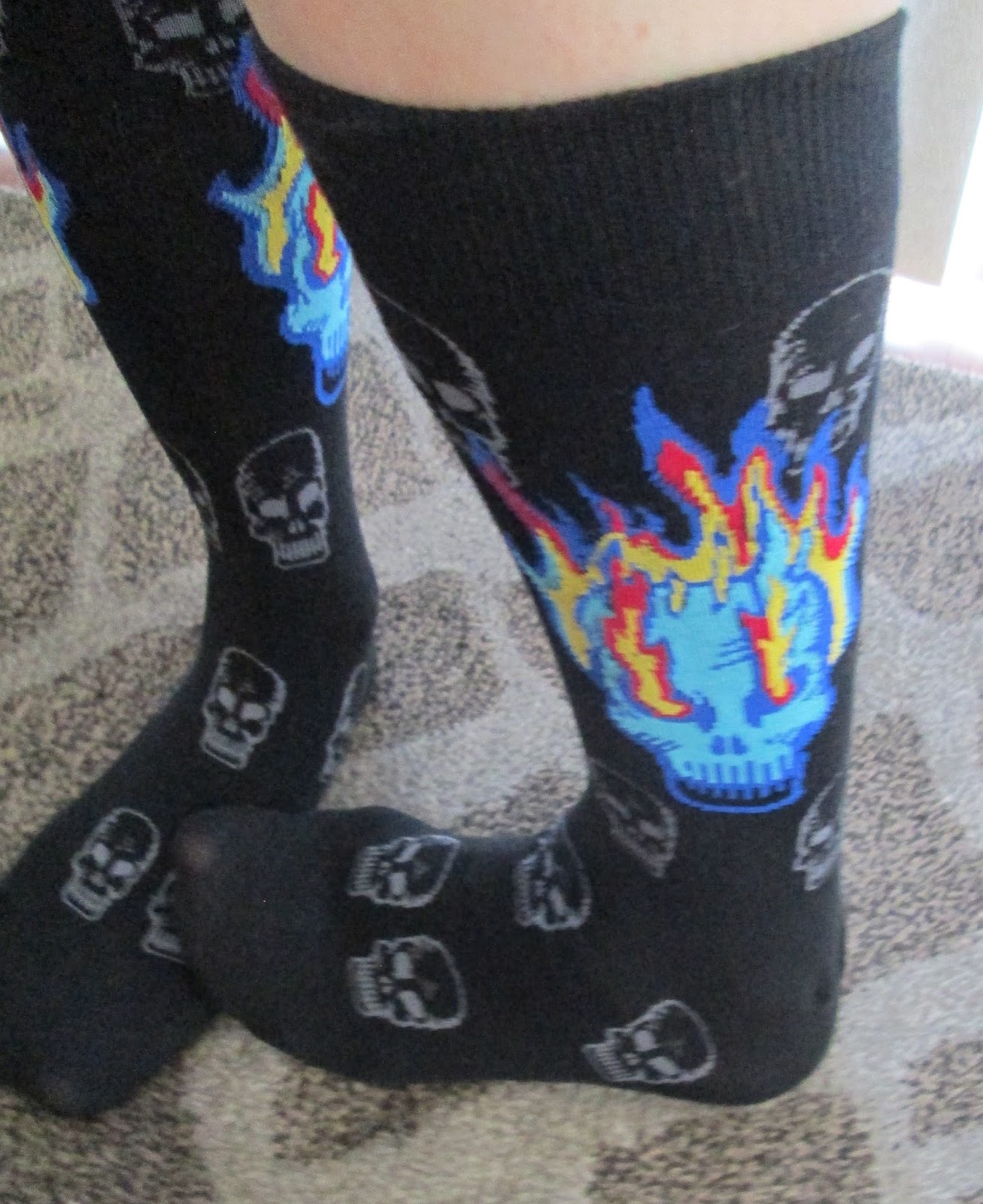 Black & white & colorful exploding skull head eyes (on Juliet's legs)