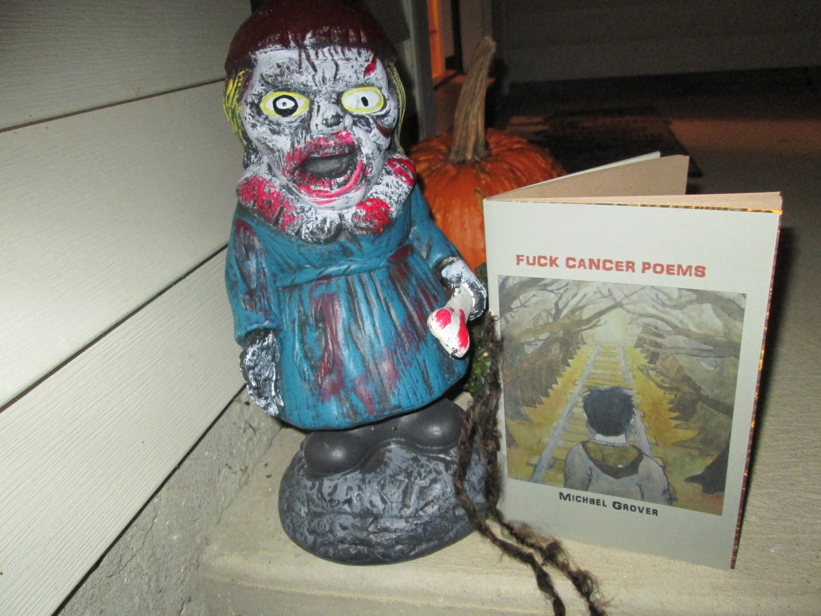 Fuck Cancer Poems by Michael Grover (with cover art created by Craig Firsdon) next to a zombie gnome.Fuck Cancer Poems is available for pre-order in the Blood Pudding Press shop here - https://www.etsy.com/shop/BloodPuddingPress