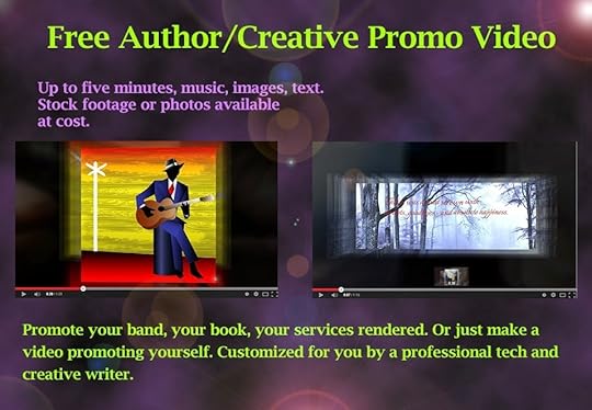 I'll design for you and give away a free author, artist, fan, band, whatever-you-want, video. It's a professionally designed promotional tool, basically. You can publicize one book, or all of your books. You could also get one to promo your band, your photography company, your editing service. If you don't have a writer or creative style business, you can make a "the day my kids were born" or "wedding" or whatever you have that you want a cool video of. There are several other projects I've made for other authors and editors here, if you want to see more samples.
