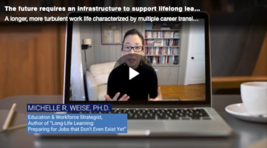 That’s what Michelle R. Weise, Ph.D. predicts and prepares us for in her book, Long-Life Learning: Preparing for Jobs that Don’t Even Exist Yet. She argues that we need to change our thinking to prepare for a soon-to-arrive future. After reading her fascinating book, we discussed her thinking and research.