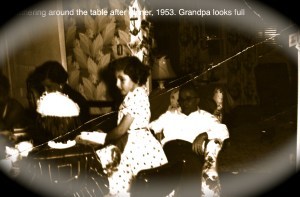 Gathering around the holiday table, 1953. Grandpa (R) looked full!