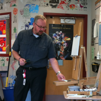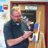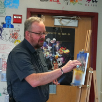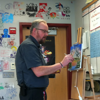 One of my friends and faithful readers is also a talented artist. Mike, who is the assistant principal at our school was a guest in the art class across the hall. Not as the assistant principal doing assistant principal stuff, but as a guest artist doing artsy stuff. In fact, Mike created a whole painting in less than a class period.