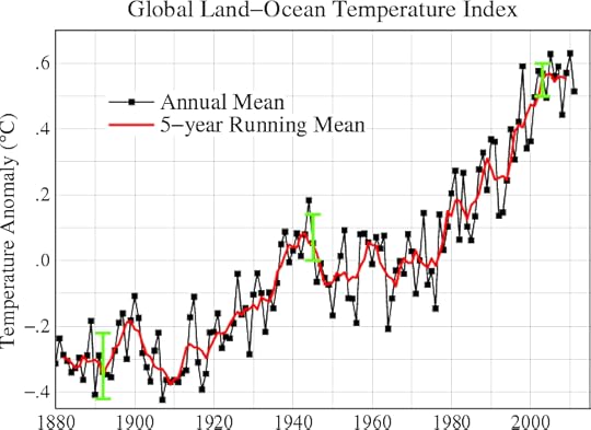 Of course, George Will is just a run-of-the-mill climate change denier with a gift for mis-using statistics. In this case, he was probably citing a World Meteorological Organization study that said, "The long-term upward trend of global warming, mostly driven by greenhouse gas emissions, is continuing. . . . The decade from 1998 to 2007 has been the warmest on record." And here's the long-term picture, also from NASA: