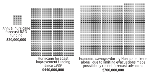 (I guess some libertarian will argue that this is an unjustified subsidy to people who live along hurricane-prone coasts. To which I would say that people value living on those coasts, and the incremental value they derive from living in Miami as opposed to, say, Oklahoma City, is probably far higher than the $20 million per year spent on hurricane forecasting research. This is different from the subsidy for federal flood insurance because, in that case, you could simply extract part of that incremental value by pricing the insurance appropriately; since hurricane forecasting ability is a public good, it would be harder to force people living on the coast to pay for it.)