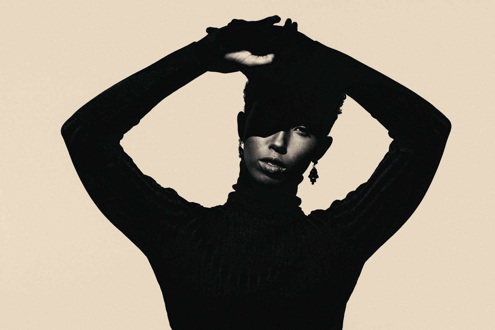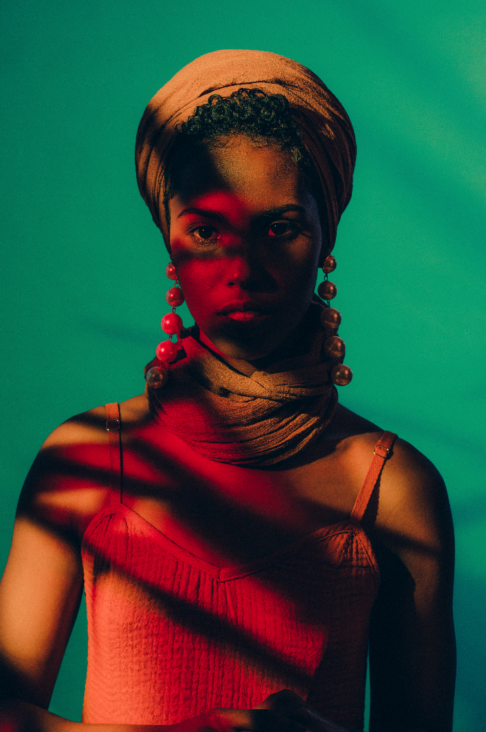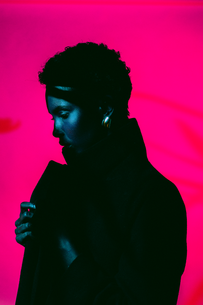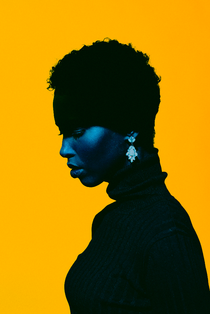 The shoot started how most of my personal shoots do. I told Farhia to bring a few outfits with her and that once I see what she brought I’d come up with an idea of how to approach lighting, etc. She arrived in a rust-colored dress and long black coat, which I immediately knew I wanted to shoot against a green backdrop. She mentioned that she’d want to add a headwrap to that look so we should shoot it last in an effort to keep her hair in order. So we started with her in a black turtleneck, which I chose to shoot with a hard light and dark shadows. I lit the background yellow and lit her blue because I knew it would look great on her skin, equally inspired by the key art for HBO’s Watchmen as well as Moonlight.