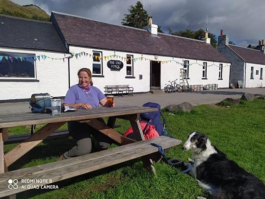 She never judges and is both fiercely gentle and gently fierce. Honestly? She is one of the reasons I initially stepped into activism, as I thought, I want some of what she’s got. And as a lovely aside, it was Amanda who told us about going to Knoydart in Scotland where she went walking with Halo, falling in love with its rugged beauty. And now, here I am, sitting precisely 110 steps (I counted last night) away from where she is pictured above, sitting in front of The Old Forge, the UK’s most remote pub.