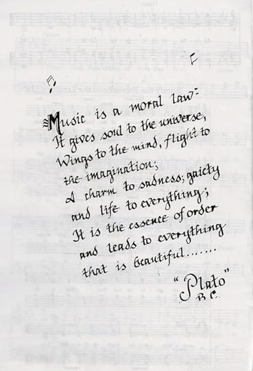 I’ll leave you with the words of Plato. And I’d like to add my own postscript to what he writes, and say that it does all the below and more: music helps to breathe life, dimension and dreams into my characters and make them every bit as real as you reading this and me writing it.