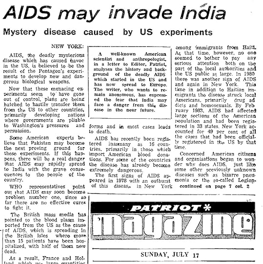 Да-да, это очень популярная версия. Расскажу о её появлении: всё началось в 1982 году – именно тогда специалисты из центров по контролю и профилактике заболеваний США (CDC) впервые использовали термин СПИД. Год спустя в одном индийском журнале появилась заметка со следующими тезисами: