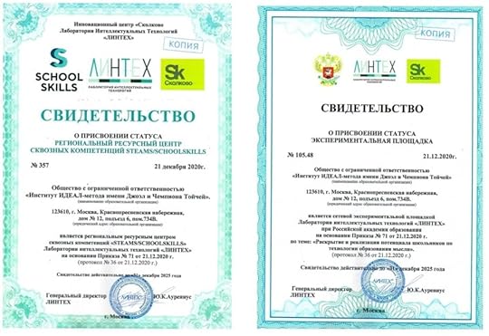 Возможно, я бы прошел мимо этого сайта, если бы мне не указали на грамоту в разделе «сотрудничество». А там написано: «Инновационный центр Сколково Лаборатория Интеллектуальных Технологий ЛИНТЕХ». «Свидетельство о присвоении статуса региональный ресурсный центр сквозных компетенций steams/schoolskills» за подписью человека по имени Аурениус Юрий Константинович.