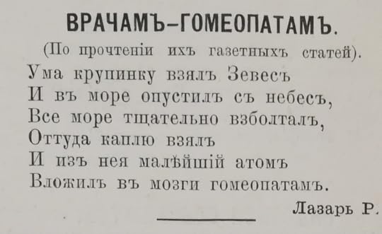В России тоже стебались над гомеопатами уже в дореволюционных журналах. Вот эпиграмма 1883 года: