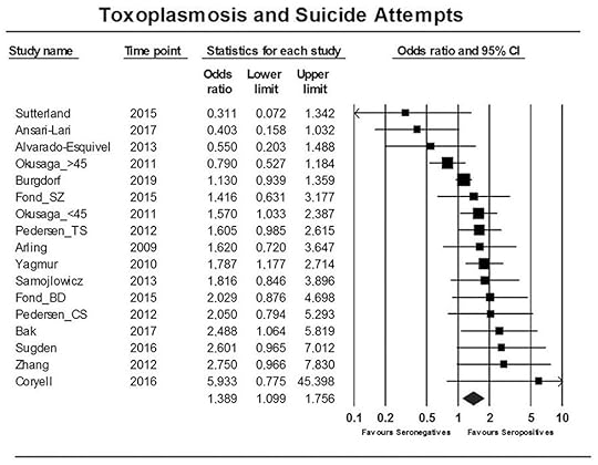 Не все, что говорит Флегр, вызывает доверие. Нам нужны примеры влияния токсоплазмы на людей, которые подтверждены множеством независимых исследований. И они есть. И, к сожалению, довольно печальные. Токсоплазму связывают с суицидом, болезнью Альцгеймера и шизофренией. Например, в одном исследовании показали, что наличие токсоплазмы в 3 с лишним раза повышает риск попытки самоубийства. В другой работе этот риск повышался даже сильнее, в 17 раз. А в одном огромном обзоре литературы по теме сказано, что в разных исследованиях этот риск как минимум в полтора-два раза выше, чем для незараженных людей.