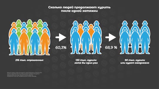 Иногда говорят, что достаточно одной сигареты, чтобы обрести зависимость. Так ли это? Учёные провели исследование – в нём приняли участие более 100 тыс. человек, которые хотя бы раз пробовали курить. 70% респондентов в итоге стали заядлыми курильщиками. То есть, если вы прямо сейчас собираетесь сделать первую затяжку, вы бросаете десятигранный кубик. Выпало число от 1 до 7? Теперь будете курить годами.