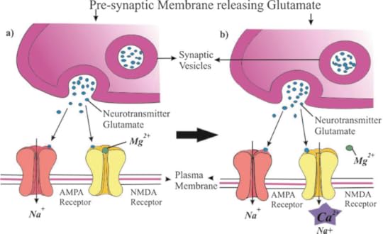 Нейроны чаще всего передают сигналы с помощью нейромедиаторов. Самый популярный из них — глутамат. У 90% нейронов в мозге есть к нему рецепторы. Да, да, это тот самый глутамат, которым нас пугают, что он в колбасе… а оказывается, он у нас уже в голове засел. Глутамат выбрасывается в пространство между двумя нейронами, которое называется синапсом. Один нейрон выделяет, другой принимает. Глутамат действует на особые рецепторы, что повышает вероятность активации второго нейрона. Но есть нюанс, за это отвечают два разных типа рецепторов. И память образуется только тогда, когда активируются оба.