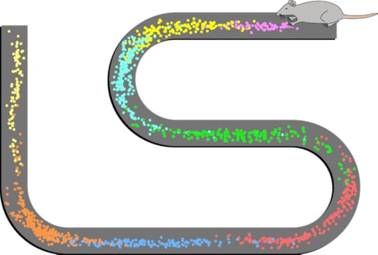 Вот мышка пробегает по лабиринту. И в разных частях этого лабиринта — группы точек разных цветов. Эти точки соответствуют активации разных нейронов. Нейрон, отмеченный фиолетовым, активируется где-то на старте лабиринта. Жёлтый нейрон — на подходе к первому повороту. Бирюзовый — внутри поворота. И так далее.