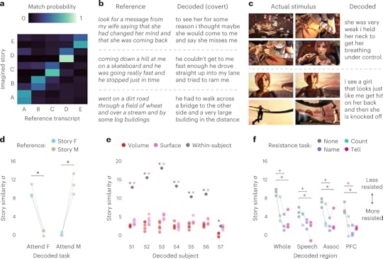 Эту опасность обсуждают авторы работы про внутренний голос человека, дескать, это может быть угрозой для приватности людей. Поэтому они провели отдельный тест — получится ли расшифровывать мысли тайком, против воли человека? К счастью, для чтения мыслей нужно, чтобы человек сперва долго добровольно сотрудничал в ходе тренировки. Ведь машину нужно обучить расшифровке мыслей на мозге именно того человека, с которым вы собрались экспериментировать. А когда экспериментаторы пытались прочесть мысли одного человека с помощью «декодера», обученного на другом человеке, получалась…. полная белиберда.