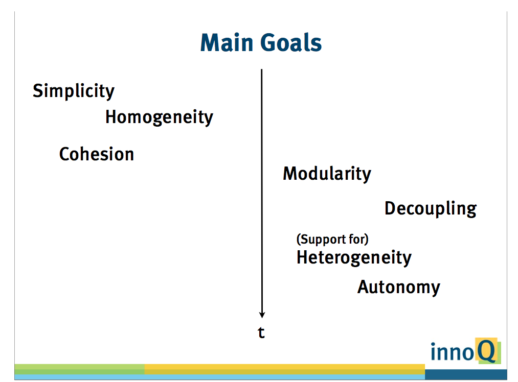 Stefan noted that early in an application's life, a monolithic application is far easier to deliver; however, as the application grows, what is important begins to change. The slide to the right shows how priorities can change over time.